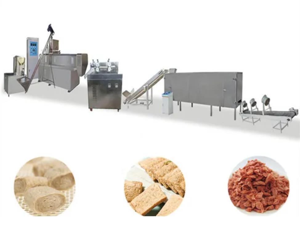 Эта линия принимает Дефаттед еду сои и еду арахиса как сырье. После смешивать, прессующ, режущ и сушащ, еда будет текстурой волокна слоя. Законченное - продукты имеют высоко- протеин; посмотрите и пробуйте как мясо; легкий к абсорбинг маслу, воде и вкусу; без холестерола и животного жира, поэтому его широко использует в индустрии мясных продуктов, продукции фаст-фуда, глубоко - продукция замороженных продуктов, и все виды вегетарианских закусок и еды.
